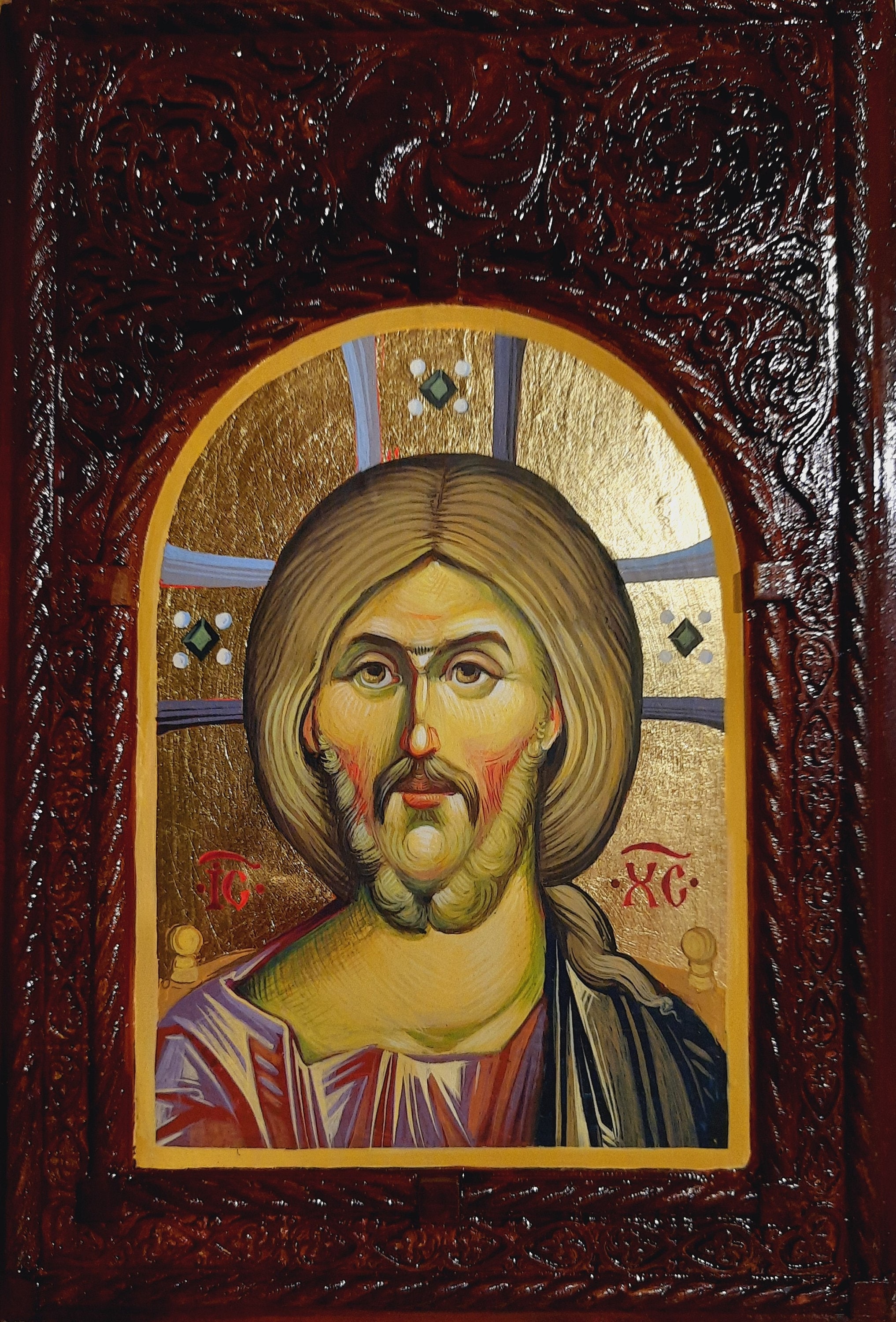 Hello :) we have not yet applied the final coats of varnish on this icon, so, if you're interested in buying it but would like a few changes, let us know, and we'll adjust it to your liking. Thank you for visiting :)